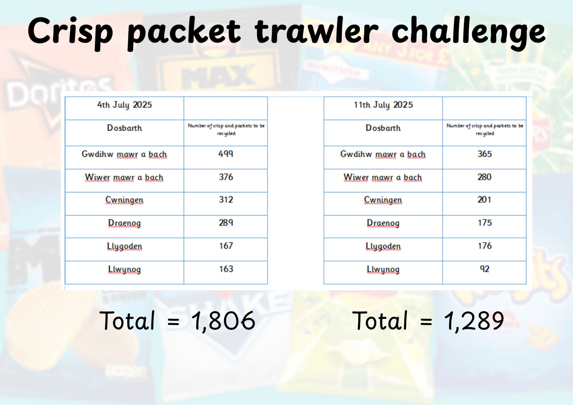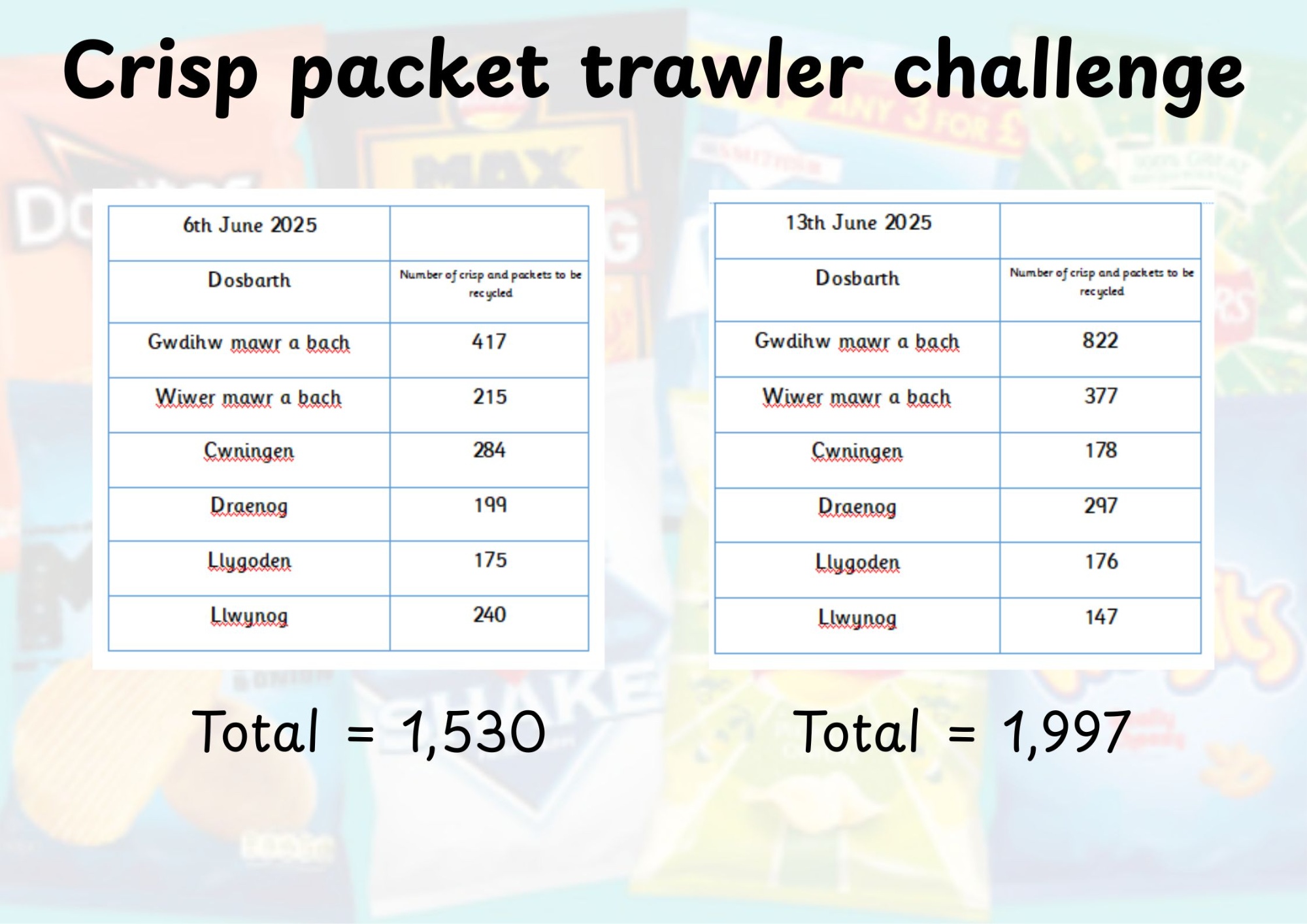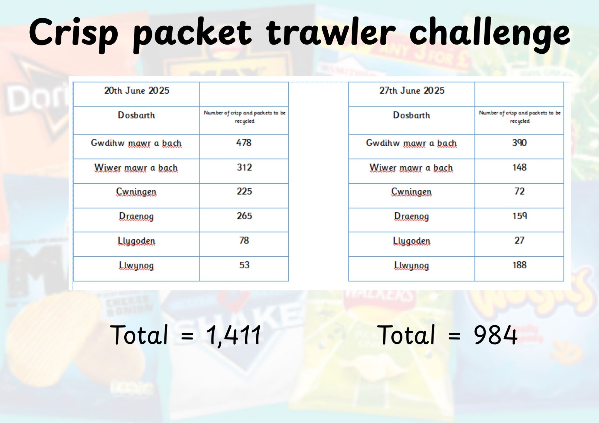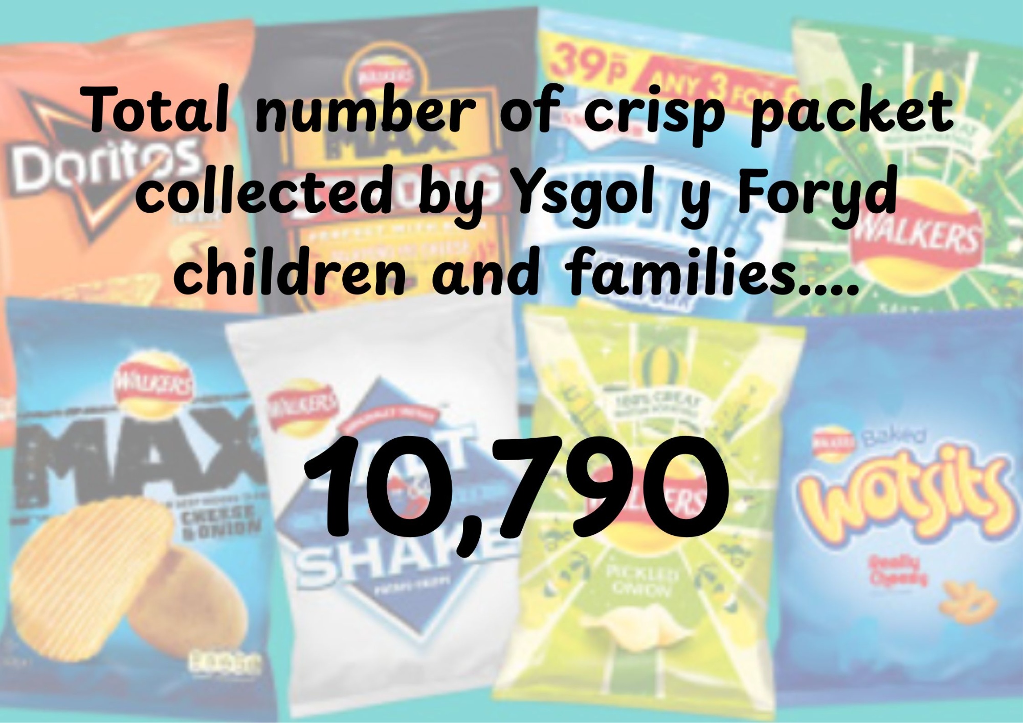 The Cyngor Ysgol and Eco Council would like to say a huge "Diolch yn Fawr" to everyone who has brought in 1 or a 100 crisp packets. You have cared for our local environment by picking so many up on your way to school and have stopped all these crisp packets from going to landfill. Diolch yn fawr.