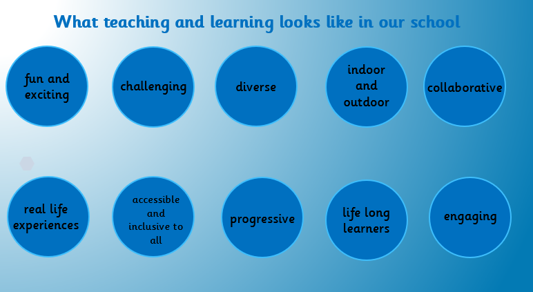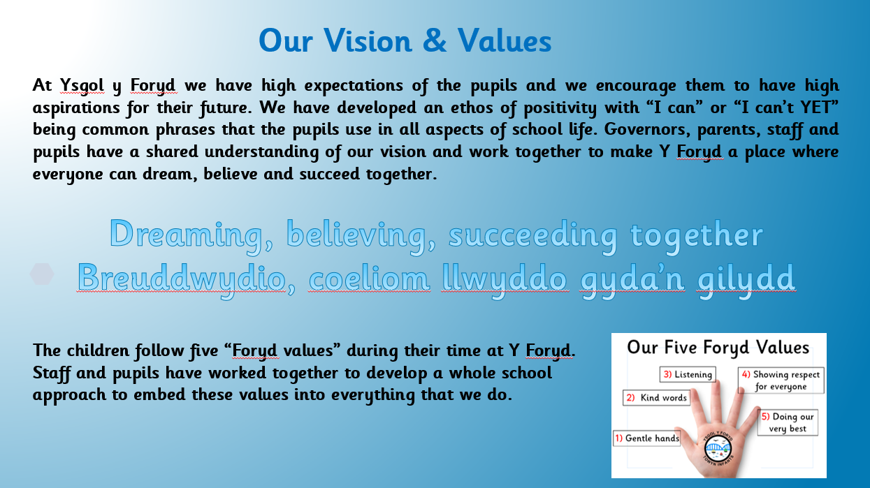 Through our motto: Dreaming, Believing, Succeeding, Together, we aim to provide the pupils with a broad range of activities and teaching styles to enable them to have big ambitions and the self-confidence to succeed together.
